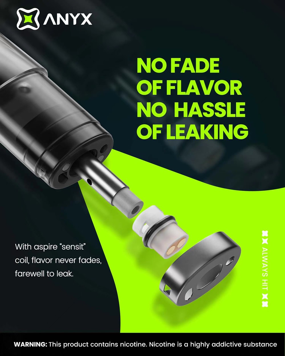 Pentru a face față îmbătrânirii atomizoarelor care pot degrada experiența utilizatorului, ANYX PRO adoptă o structură de separare bobină-e-lichid, care previne schimbarea aromei cauzată de contactul prelungit dintre bobina folosită pentru depozitarea e-sucului și lichidul atomizat. Când este utilizat, produsul nu numai că garantează aroma proaspătă furnizată de vaporizator, ci și evită eficient scurgerea lichidului atomizat.