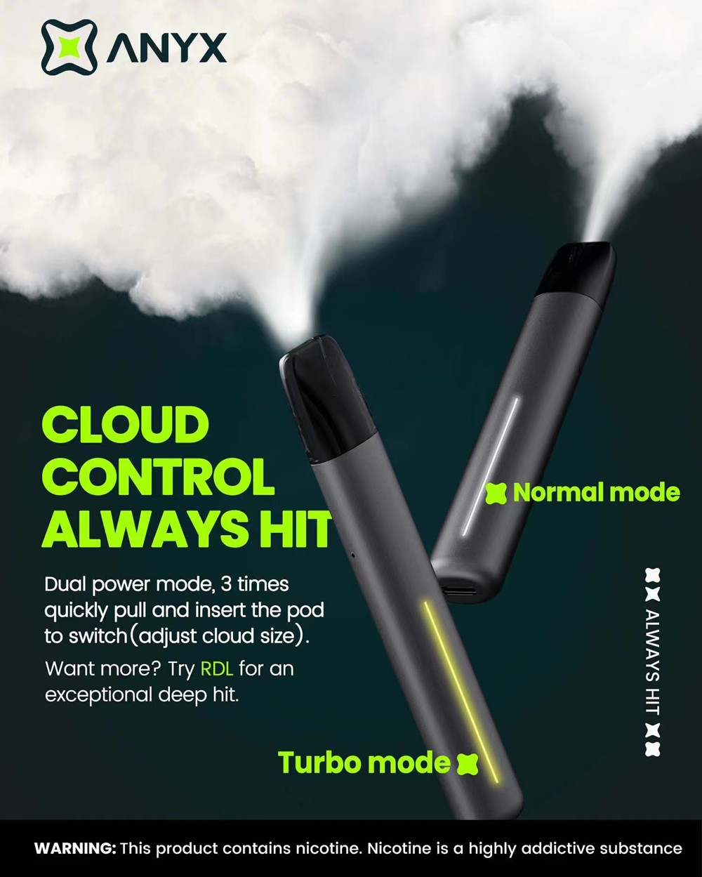 Fiind primul sistem de pod închis cu mod dublu din lume, ANYX PRO este echipat cu cip de control inteligent al temperaturii MCU și acceptă modul Restricted Direct-Lung (RDL), oferind o experiență instantanee, dar deosebit de diferită, în funcție de modul ales: Gustul puternic și dens al modului Turbo, alături de experiența delicată și moale a modului Normal. ANYX PRO este conceput pentru a satisface diversele preferințe ale vaporilor, promițând o experiență gustativă mai bogată.